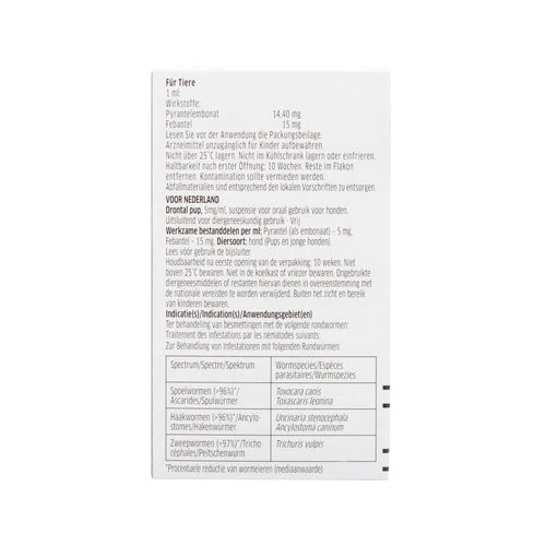 1 ml Drontal Pup pro kg Körpergewicht, direkt verabreichen oder unters Futter mischen. 1 ml Drontal Pup entspricht 15 mg Febantel und 14,4 mg Pyrantelembonat pro kg Körpergewicht.