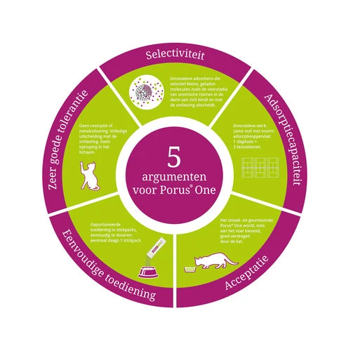 Porus One unterstützt die Nieren von Katzen. Das Adsorptionsmittel fängt im Frühstadium Nierentoxine (urämische Toxine) im Darm, die dann mit dem Stuhl ausgeschieden werden.